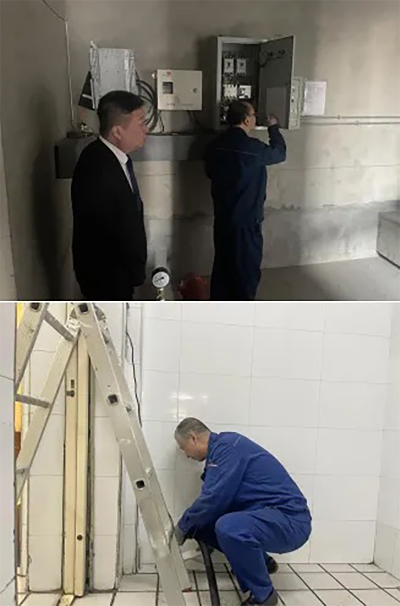 安保部值班人员对楼内电器设施、电子设备、消防设施进行检查