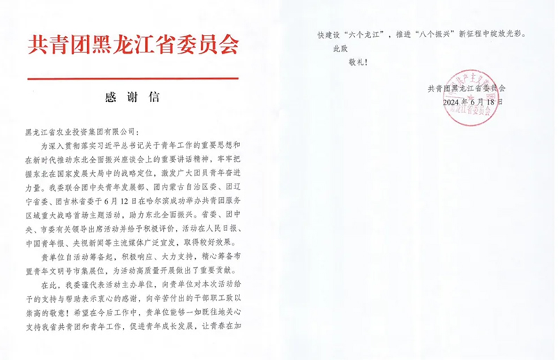 近日,共青团中央“青春为中国式现代化挺膺担当”——共青团助力服务新时代东北全面振兴青春建功主题活动在哈尔滨举办。农投集团团委收到来自共青团黑龙江省委员会的感谢信,感谢农投集团的大力支持和付出,并在活动中展现了农投集团青年风采。农投青年用青春的方式表达“身在最北方、心向党中央”的志向,释放“青年+东北”的组合效能,展现青春为新时代东北全面振兴挺膺担当的信心决心和火热实践。