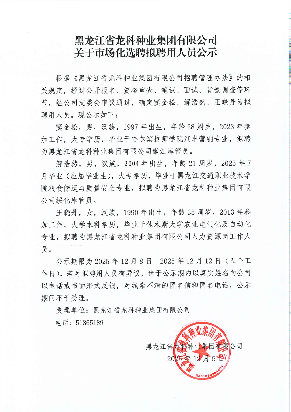 黑龙江省龙科种业集团有限公司关于市场化选聘拟聘用人员公示