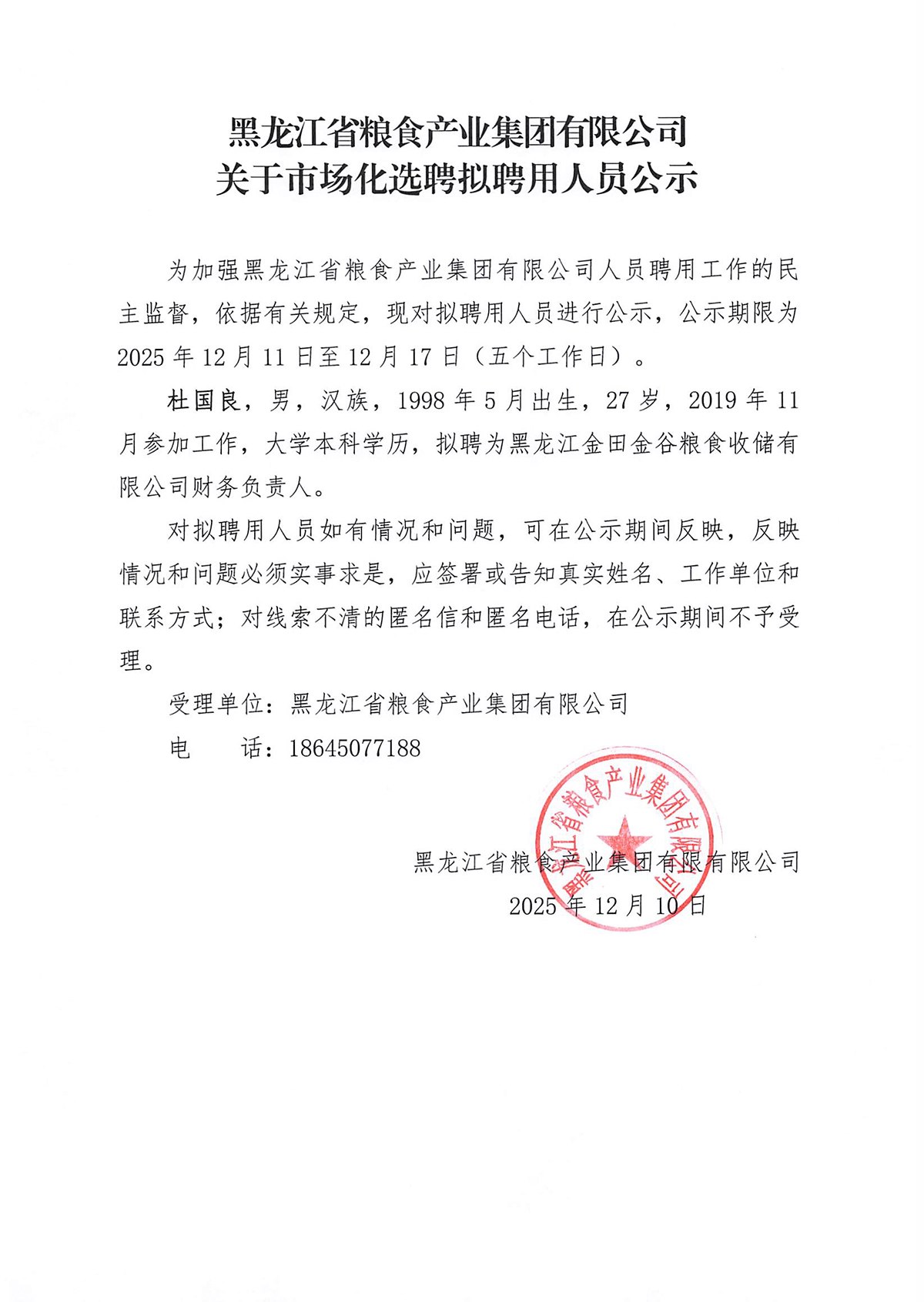 黑龙江省粮食产业集团有限公司关于市场化选聘拟聘用人员公示